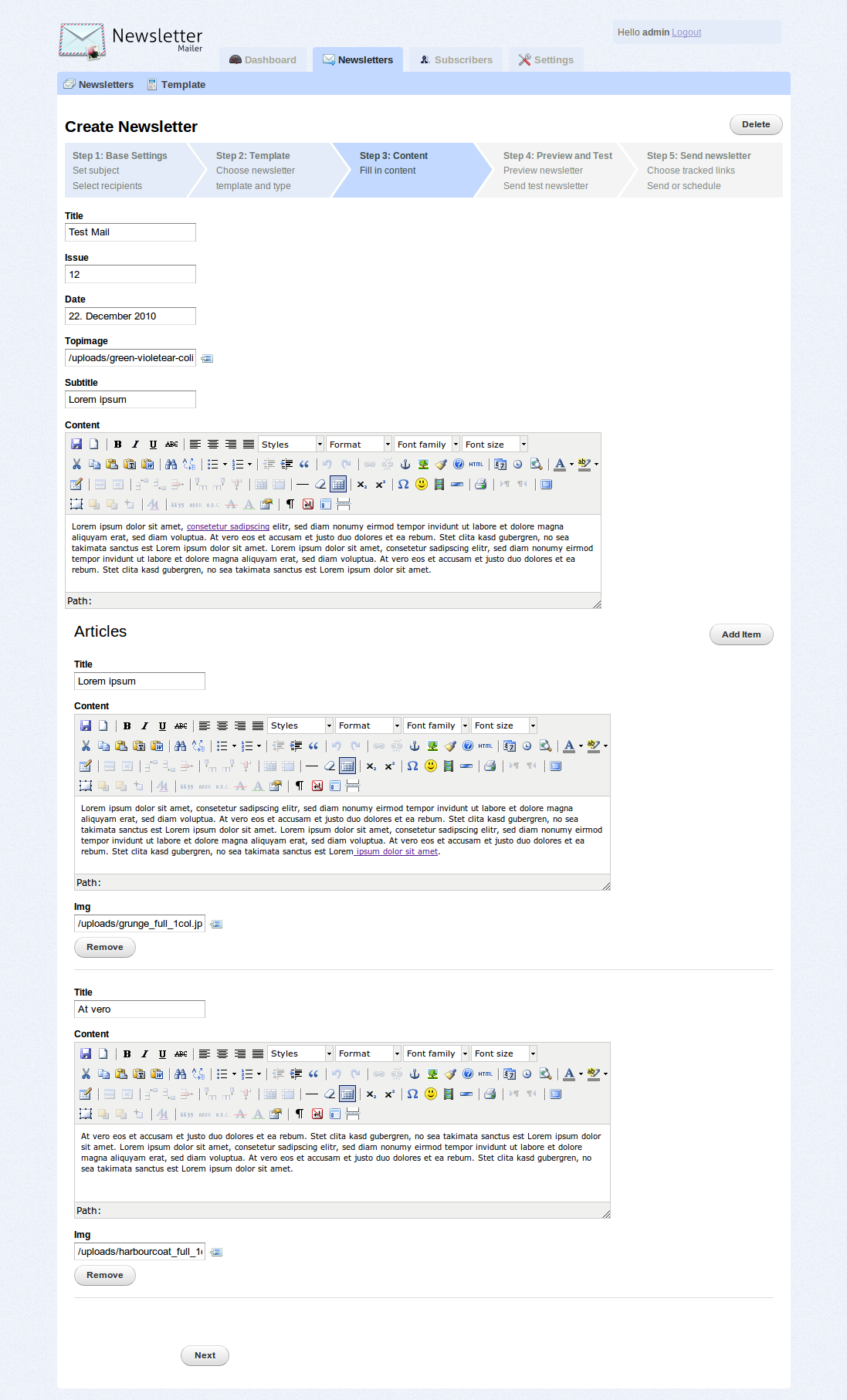 After choosing the template and filling in the content. Step four will show you a preview of your newletter. You can also send a test mail of your newsletter to any addresse.